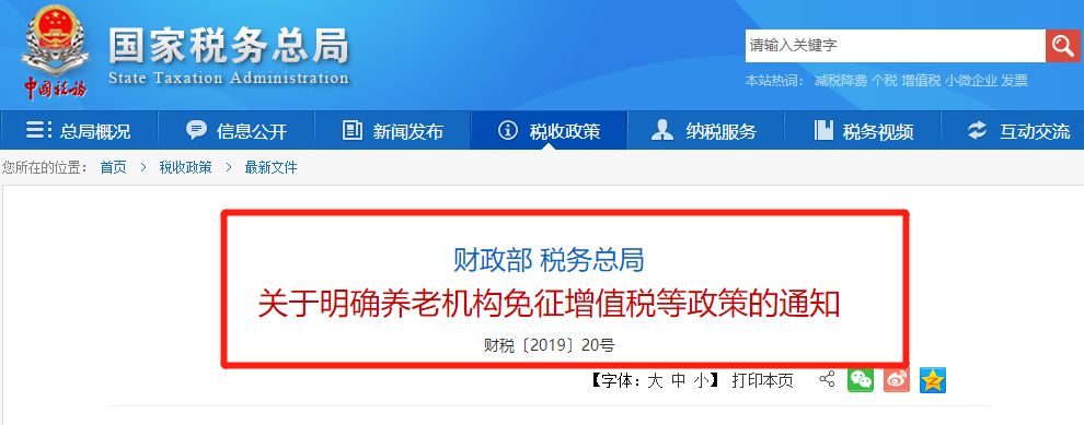 政策依据:《关于明确养老机构免征增值税等政策的通知》(财税〔2019〕20号)